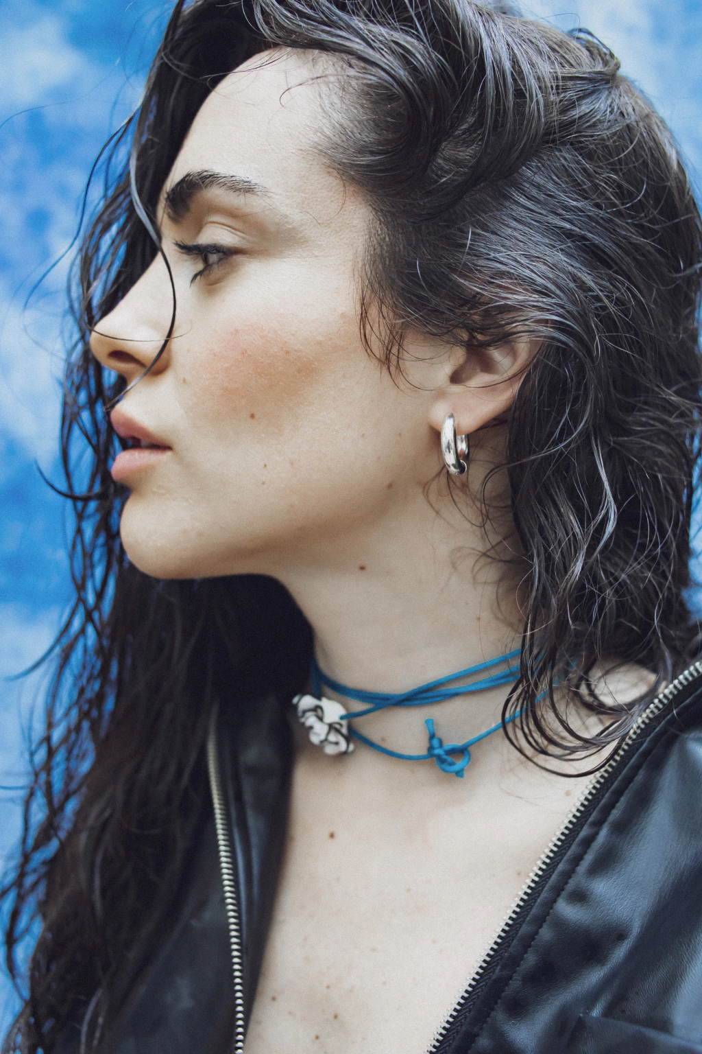 Choker con pieza en forma de flor de porcelana enhebrada en hilo de seda azul.