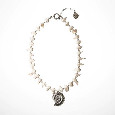 Collar confeccionado con perlas del río uniformes color blancas y tornasoladas con dije y terminaciones en níquel.