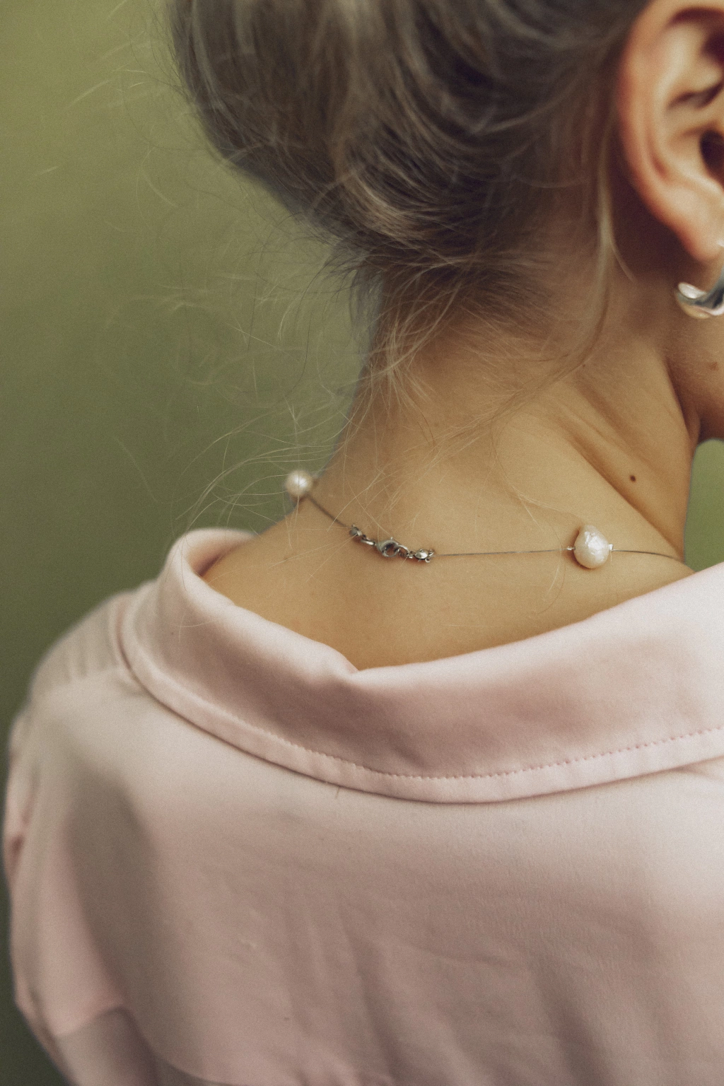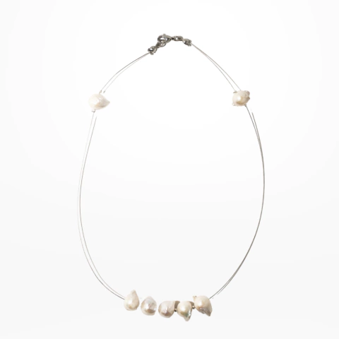 Collar confecionado con perlas del río enhebradas en tanza metálica. Terminación y cierre en acero.