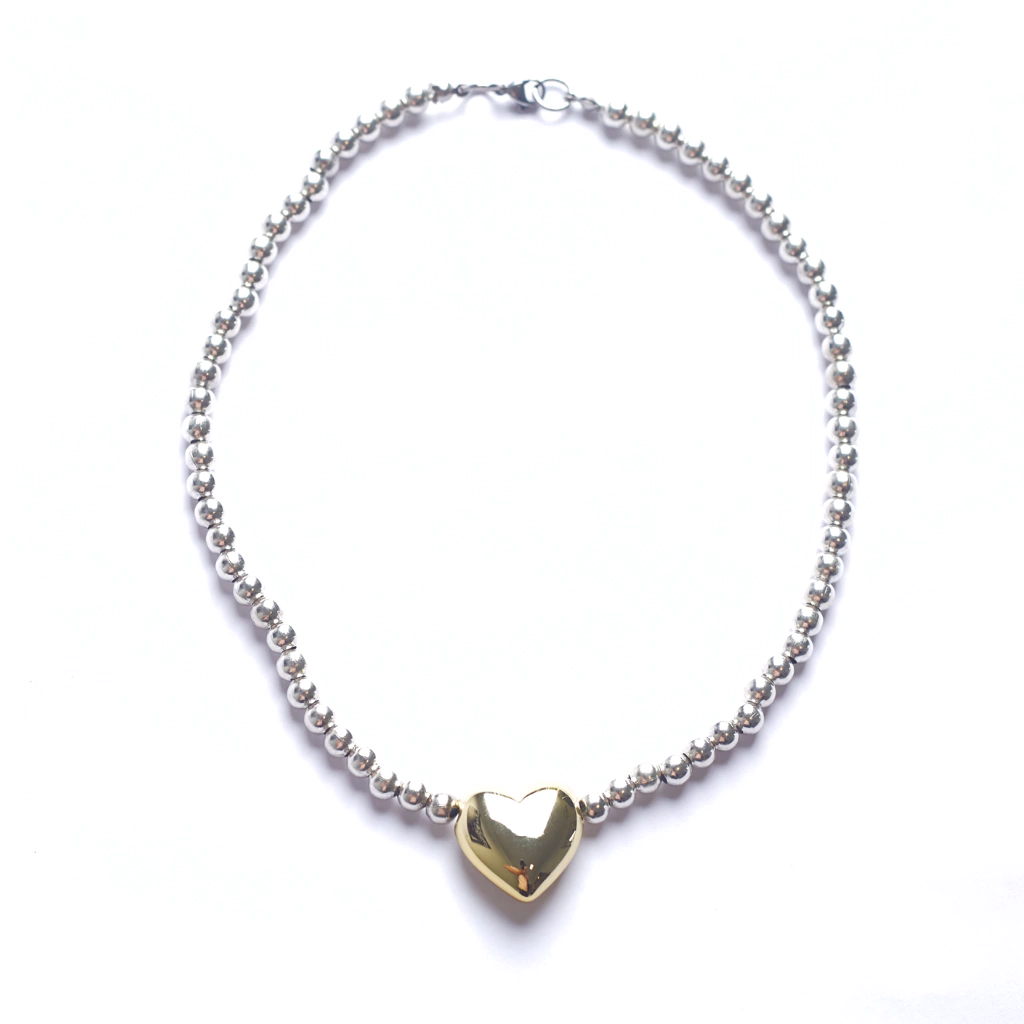 Collar confeccionado con pelotitas de niquel y dije de corazón dorado.