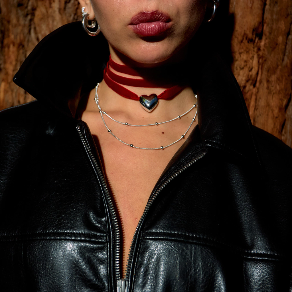 Choker confeccionado con hilo de gamuza rojo + dije de corazón plateado enhebrado.