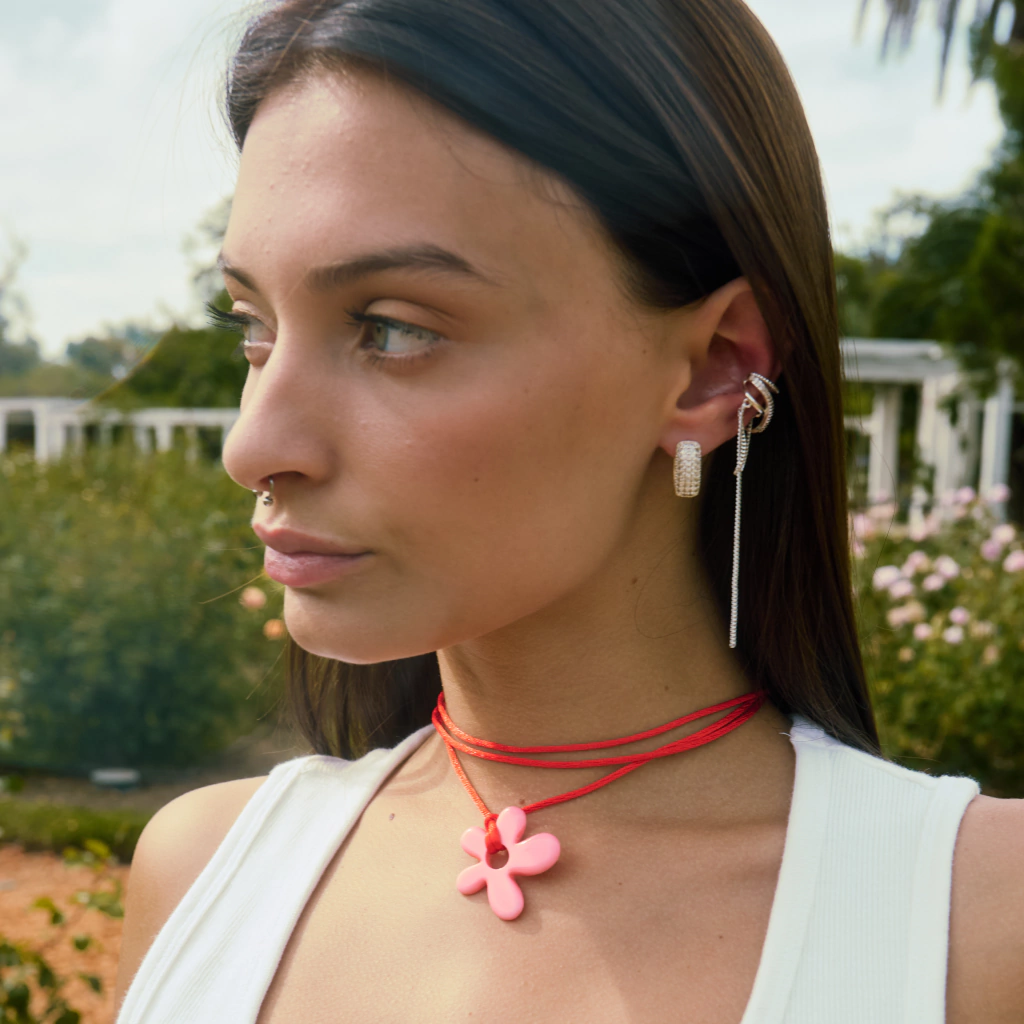 Choker confeccionado con hilo de seda rojo. Dije de flor rosa de resina enhebrado.