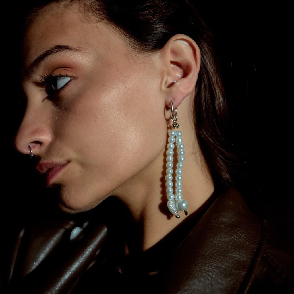 Aros con argollitas de acero blanco y 2 tiras de perlas blancas + dije de corazón perlado.